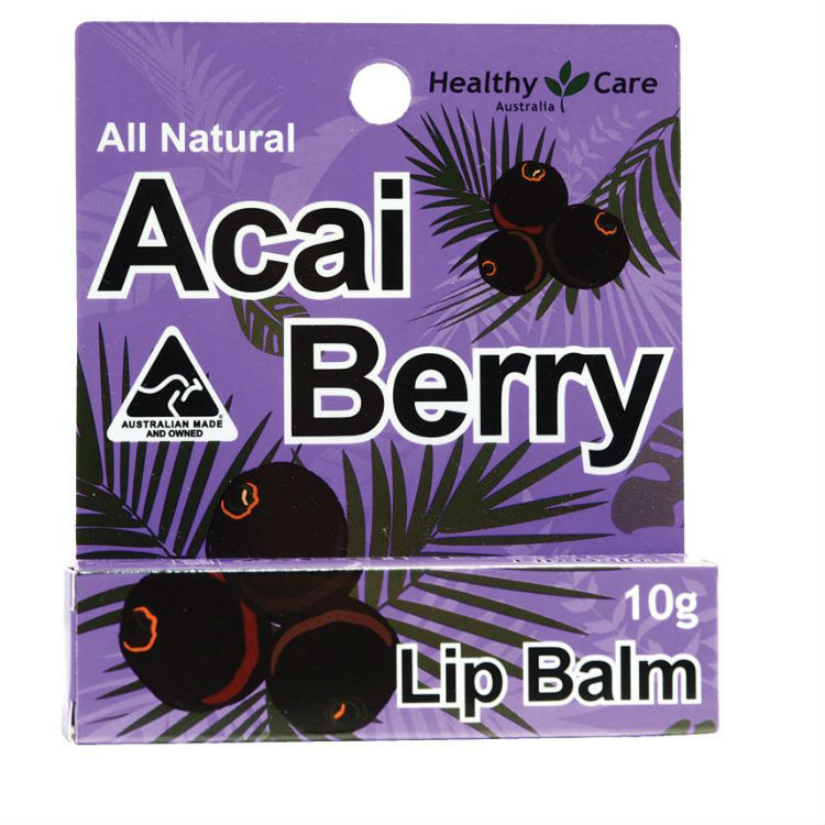 Healthy Care Acai Lip Balm is an ultra hydrating lip balm containing??the powerful Acai Berry oil which is cold-pressed from the seed of the Acai Berry. This deep purple berry grows in the Brazilian Rainforests CONTAINS Vitamin B1, B2, B3, C and E as well as healthy Omega-3, 6, and 9 and is rich in free radicals fighting antioxidants.